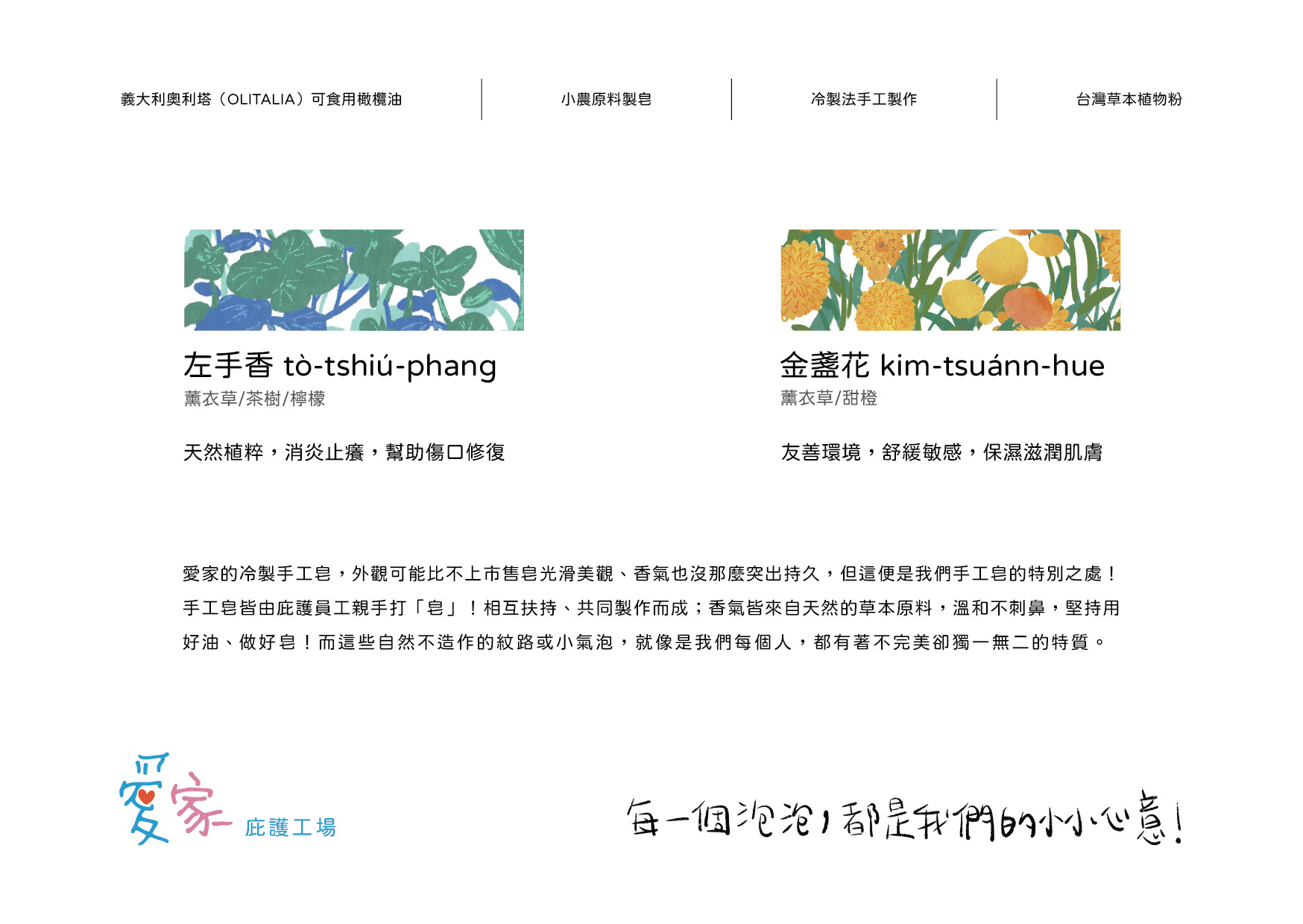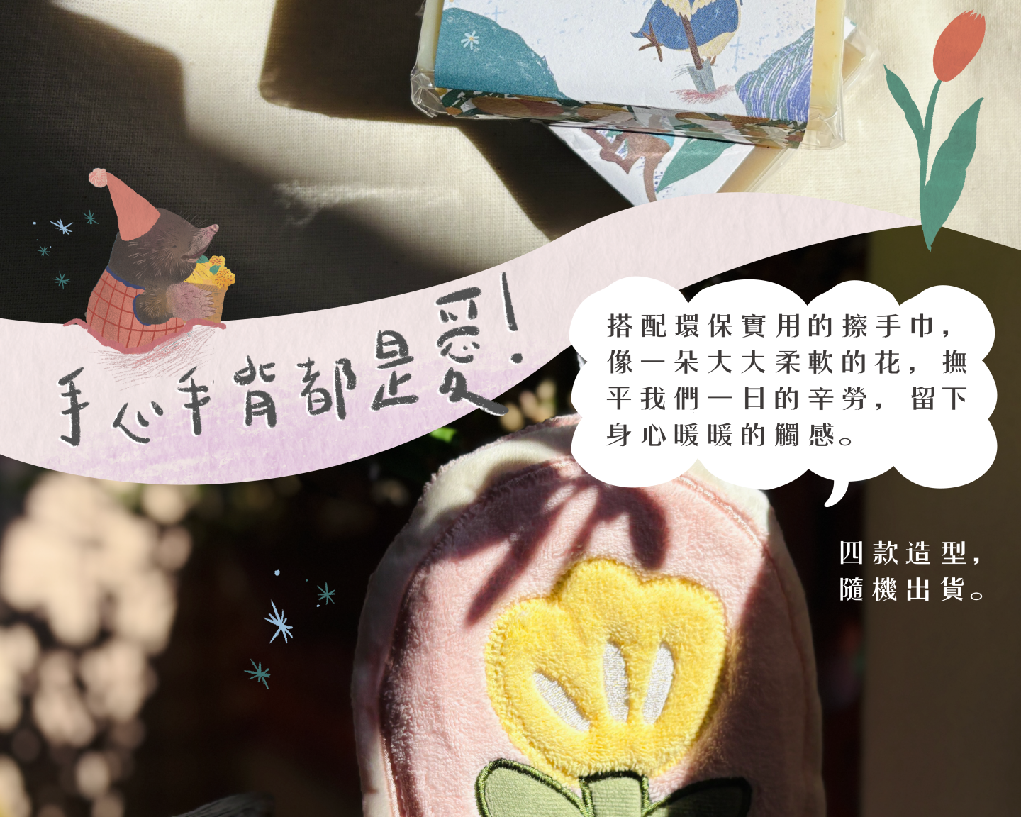 - 內容物:左手香手工皂95g/顆+金盞花手工皂95g/顆+小花擦手巾(皆附皂網、提袋)/盒