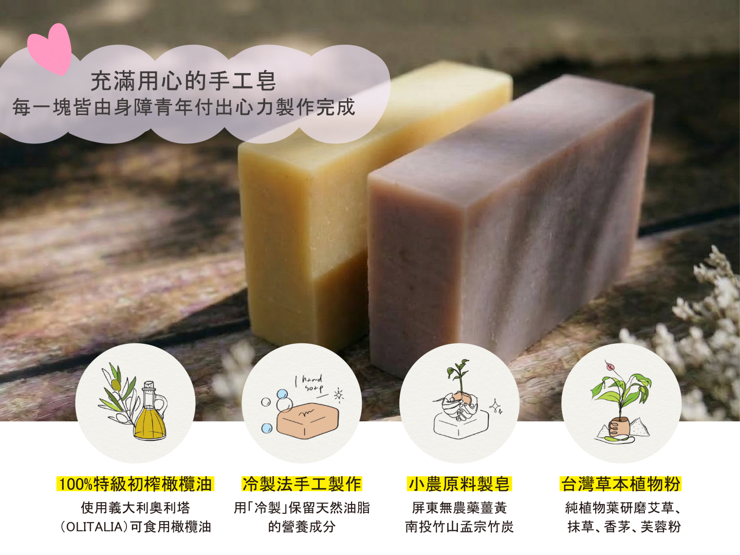 注意事項:本產品為純手工製造,故色澤、外觀略有差異,但不影響手工皂品質,請安心使用。