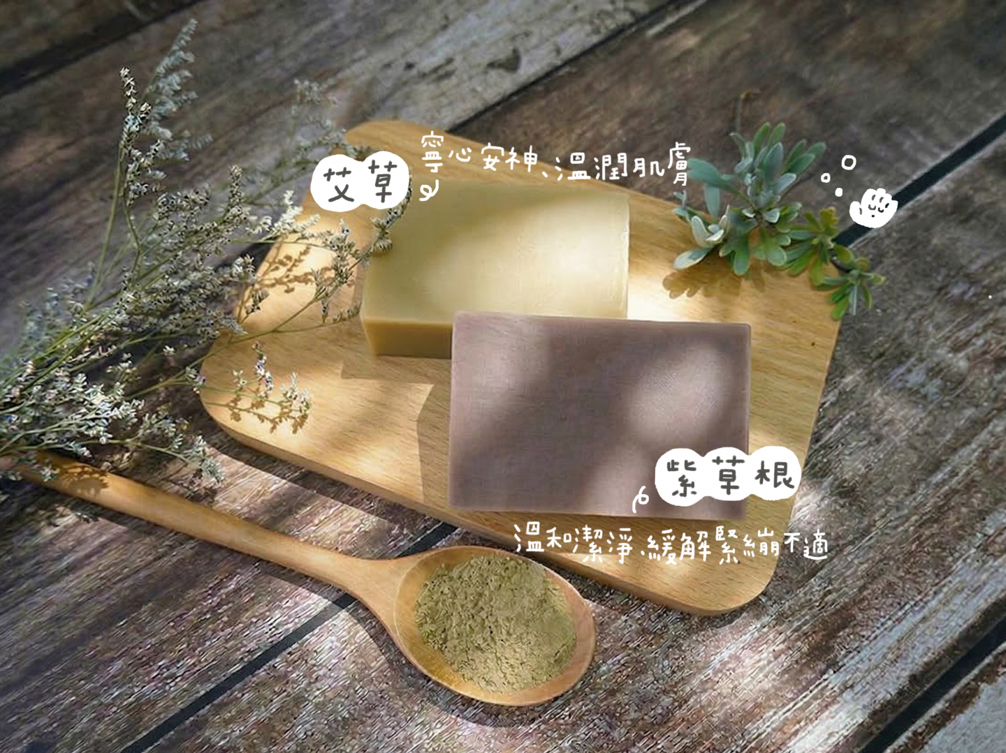- 艾草:Olitalia橄欖油、棕櫚油、椰子油、可可脂、氫氧化納、純水、台灣植物粉(艾草、抹草、芙蓉、香茅)、精油 (茶樹、尤加利、檸檬香茅)